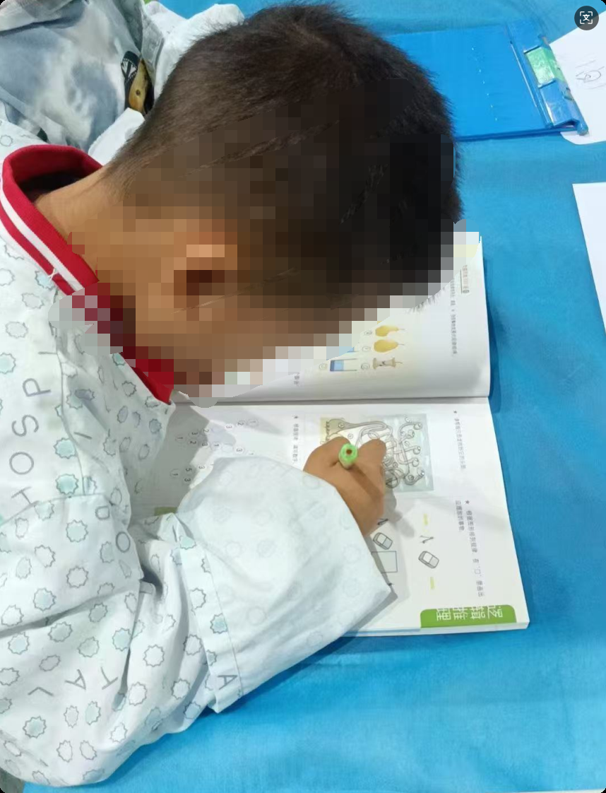 妈妈喂他喝了水,这爱学习的小家伙,在复苏室里还拿起笔做起了数学题。