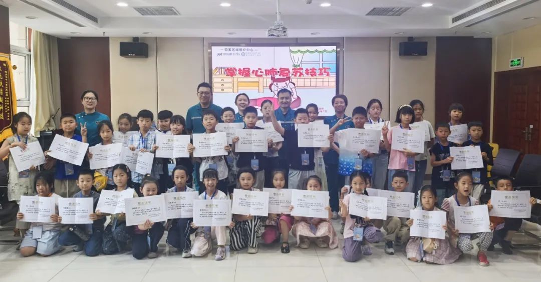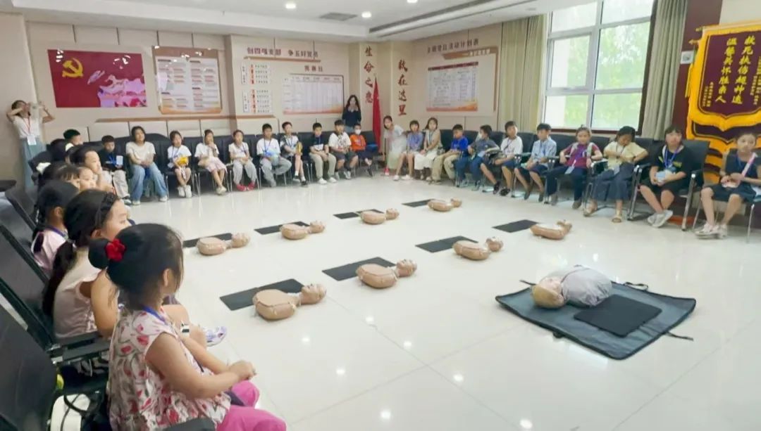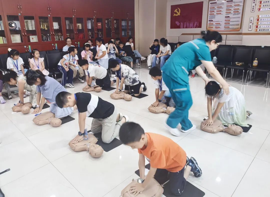 在急救知识的学习体验环节,孩子们在紧张的案例模拟中学习急救知识,医护人员生动地向孩子们传授心肺复苏技巧,考核通过获得“荣誉证书”。