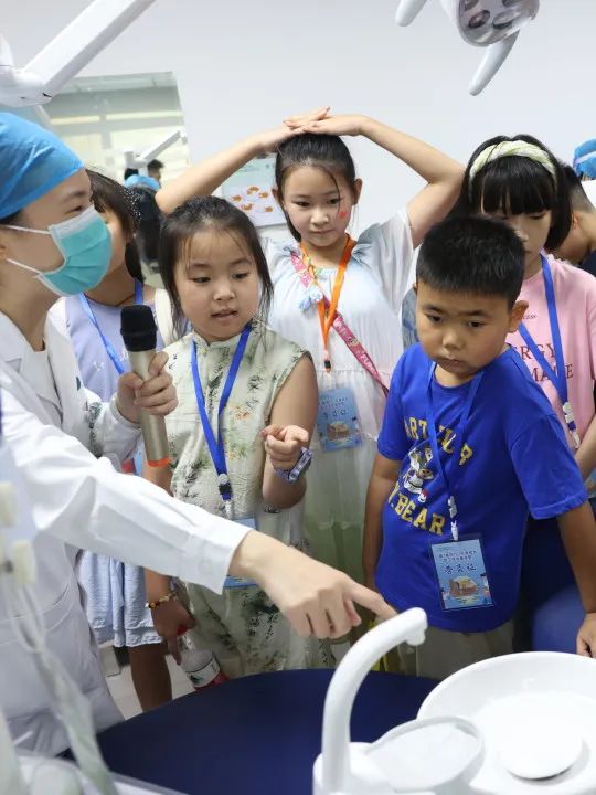 口腔科医生带领孩子们参观科室并介绍牙齿检查器械分类和功能。