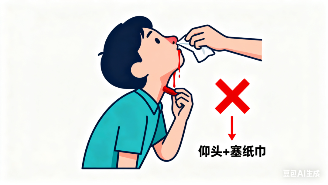 仰头止血:鼻血不会凭空消失,反而会顺着鼻腔倒流进咽喉、气管,轻则刺激胃黏膜引发呕吐,重则误吸进气管导致窒息,凝固的血块还可能堵塞气道;