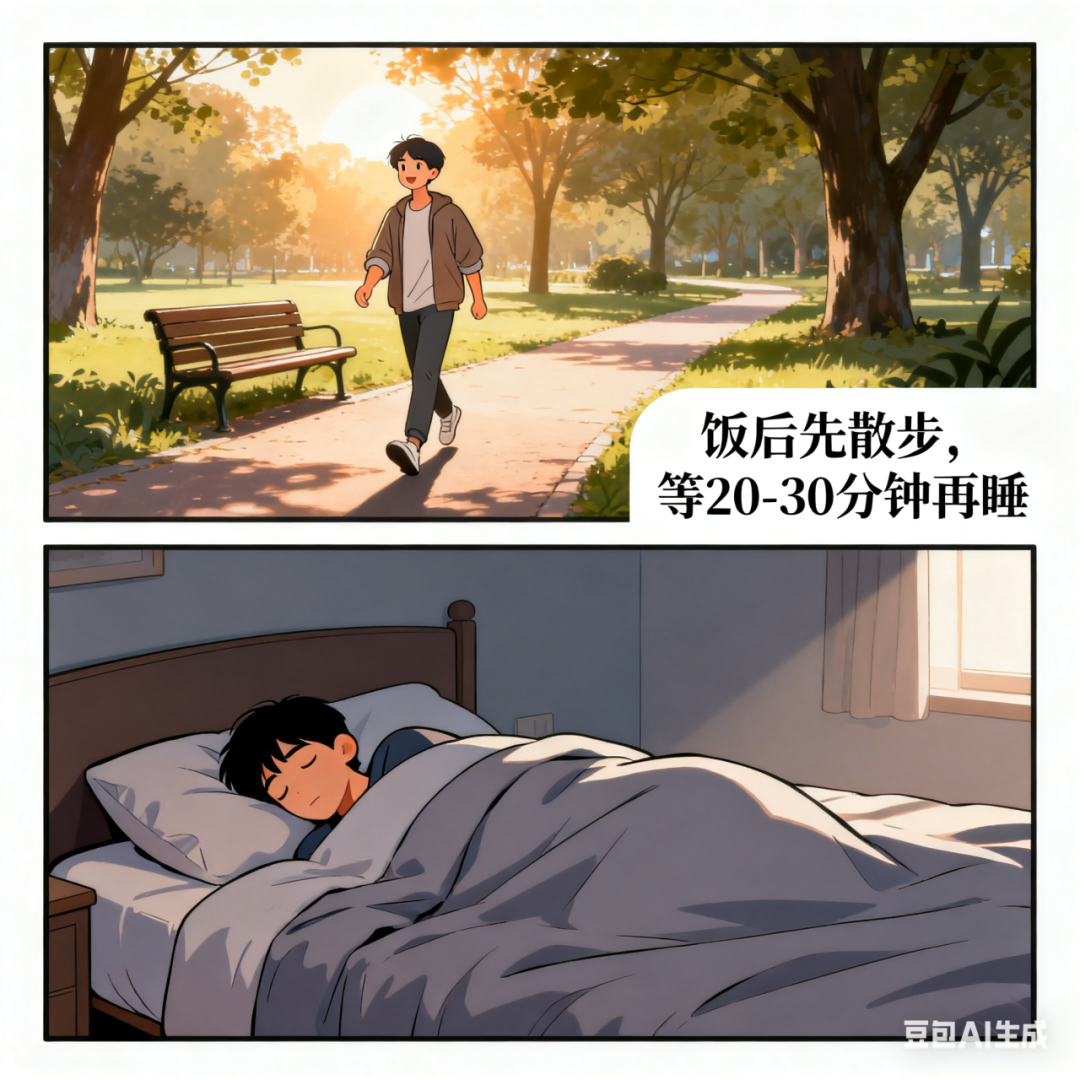 建议饭后先散散步,等 20-30 分钟再睡。