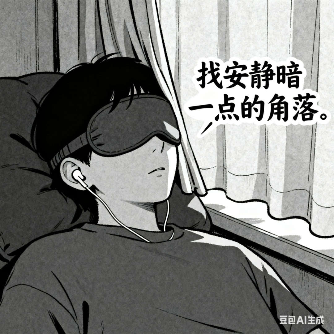 噪音、强光会让人睡不踏实,有空置休息室或会议室最好,没有的话就找个人少的工位,拉上窗帘、戴上耳塞和遮光眼罩