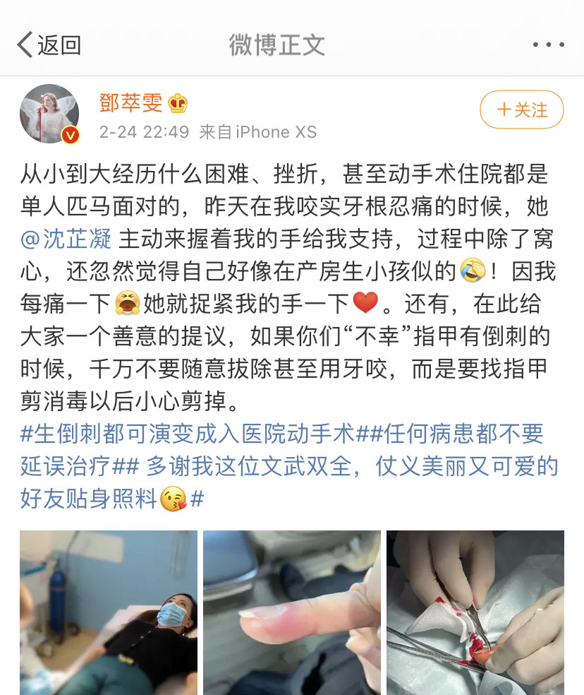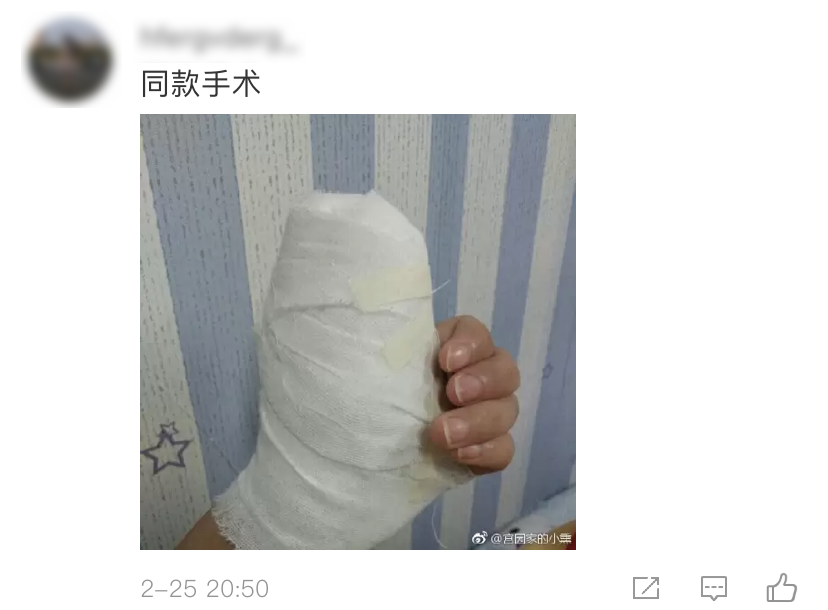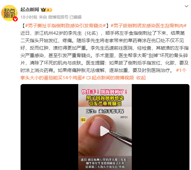 当事人发微博说,自己只是拔个倒刺,不料最终被送到医院动了场手术。