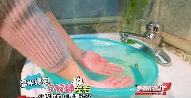 将手放在温水里面浸泡大概5分钟左右,让皮肤的角质层软化。
