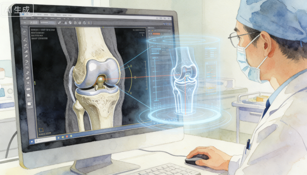 术前个体化规划:基于患者CT数据,系统构建1:1比例的3D数字膝关节模型,可在虚拟空间完成术前推演,精准测算假体安放角度、关节力线等关键参数,为患者定制专属手术方案,告别“千人一面”的诊疗模式。