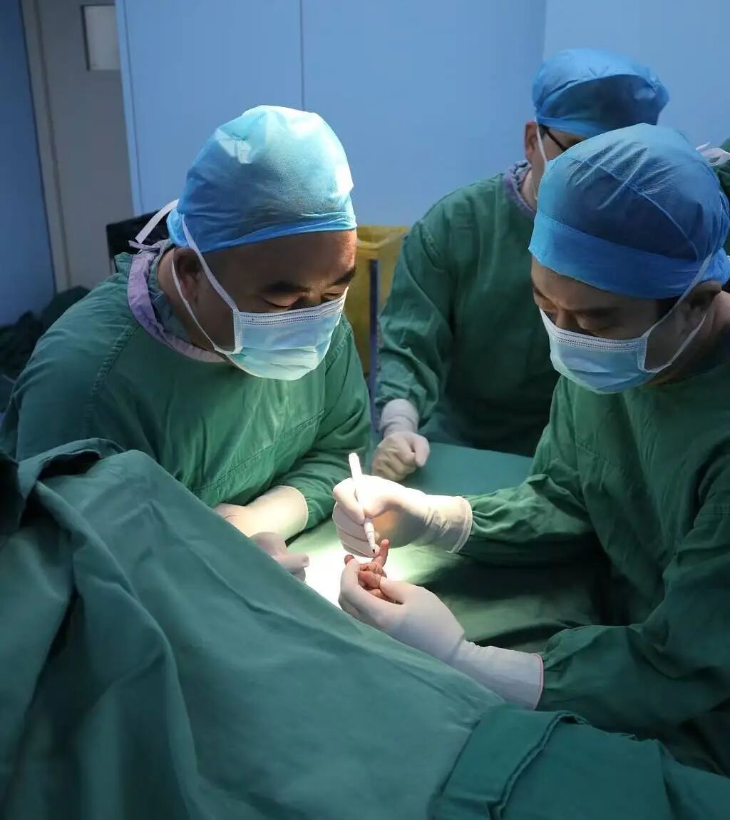 手术由郭阳院长主刀,在显微镜的辅助下,手术团队精细分离宝宝手足处的粘连组织,小心翼翼保护每一根细小的血管、神经与肌腱,精准修复创面并重建手足正常的生理结构。
